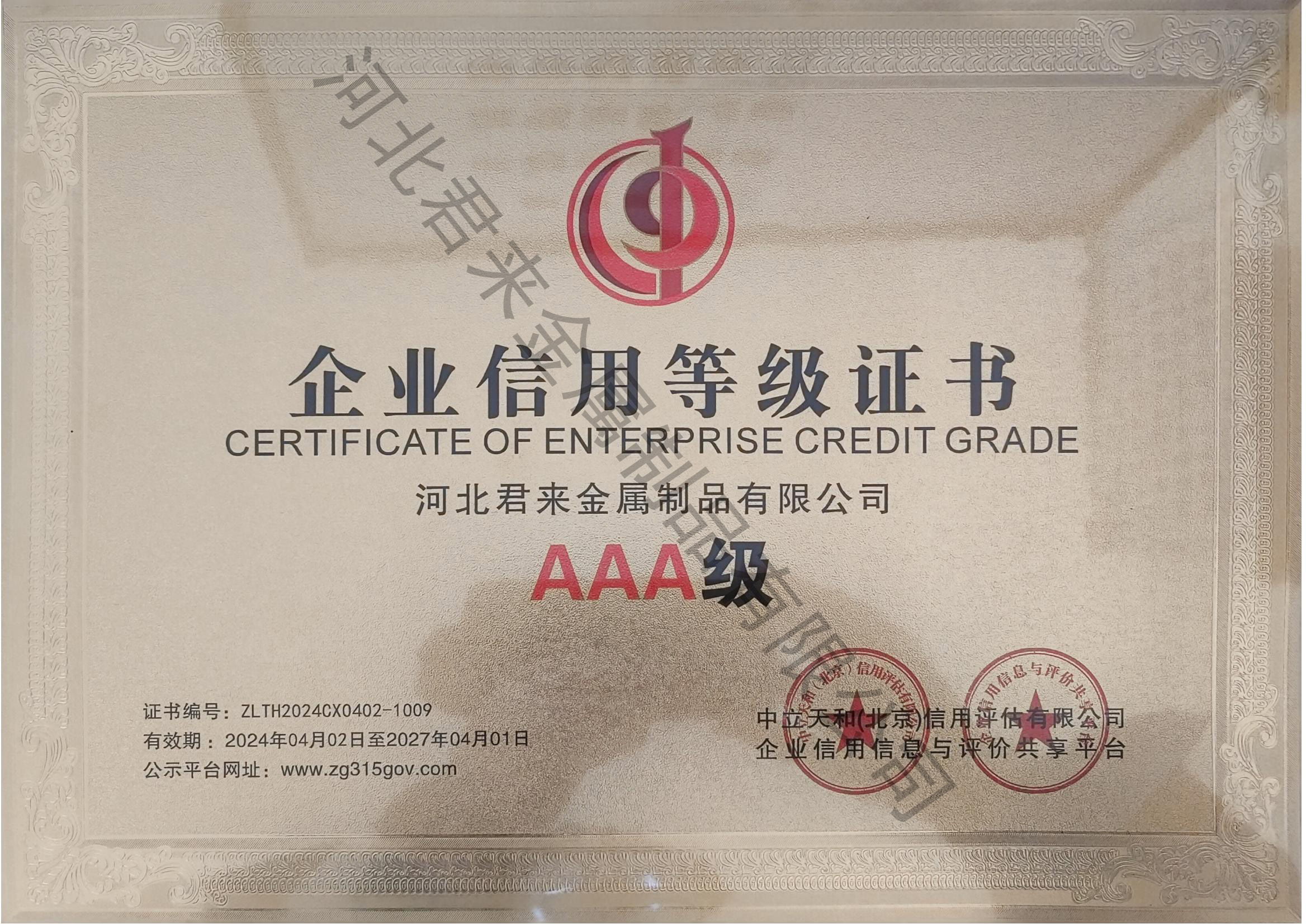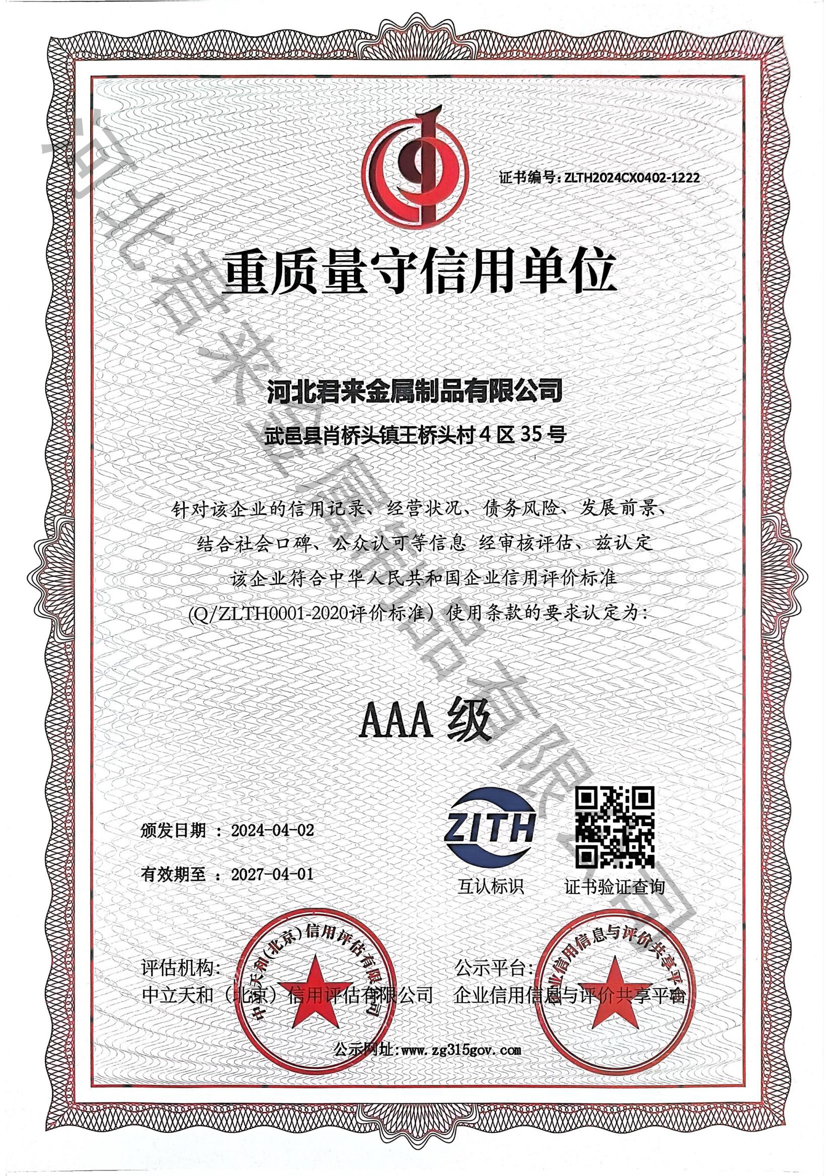 重質量守信用等級證書